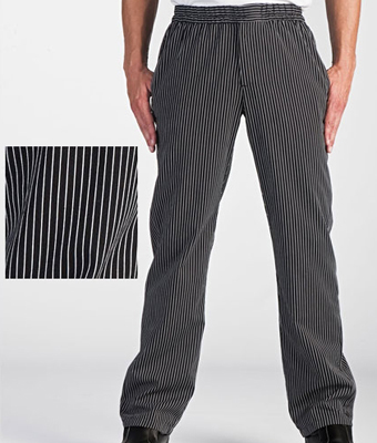 cod. 203 COULISSE NERO GESSATO Pantalone da cuoco - Tessuto in 100% cotone - gessato/nero elastico in vita con coulisse bottone e zip |