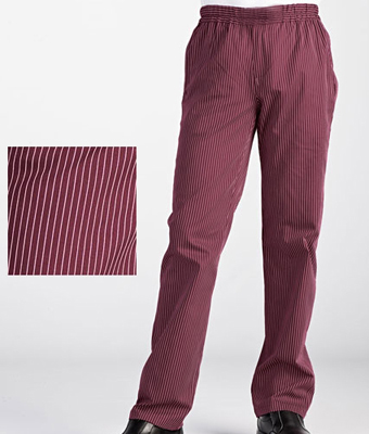 cod. 206 COULISSE BORDEAUX GESSATO Pantalone da cuoco - Tessuto in 100% cotone - bordeaux gessato elastico in vita con coulisse bottone e zip |